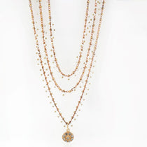 This layered white and gold necklace hits the sweet spot between rustic and refined. The pops of white evoke traditional western jewelry—but the dainty detailing keeps it fresh and modern.