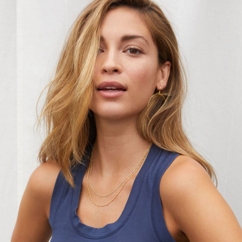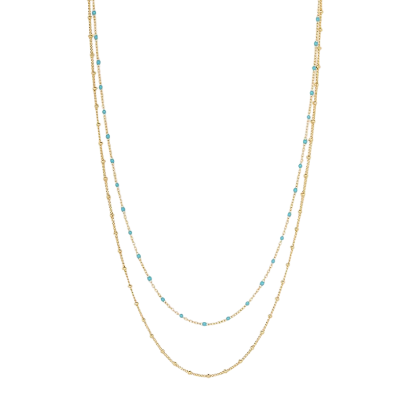 With two textured gold chains accented by turquoise or ivory enamel beads, this necklace makes layering a breeze. This piece a must have for spring and summer.