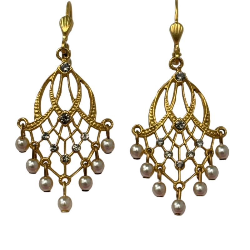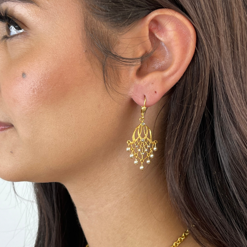 Everyone should have a classic pair of statement earrings. These delicate earrings have an intricate design punctuated with dangling crystals or pearls for the perfect pair to add a touch of elegance to any outfit.