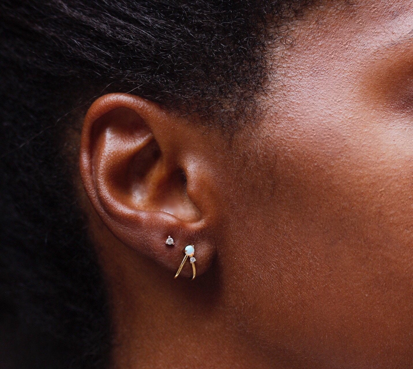 The unique shape of these earrings draw in the eye and delight the ear. Opals, cz trim and gold add elegant finishes and sparkle.