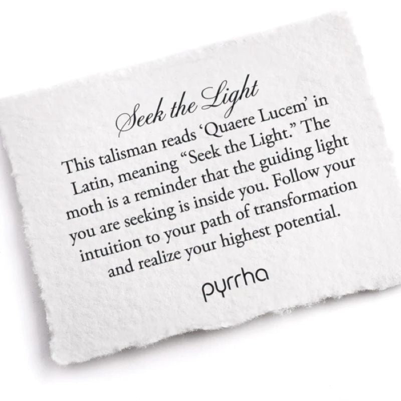 This talisman reads 'Quaere Lucem' in Latin, meaning "Seek the Light." The moth is a reminder that the guiding light you are seeking is inside you.  Follow your intuition to your path of transformation and realize your highest potential.