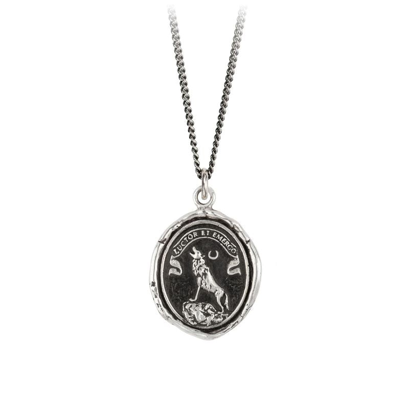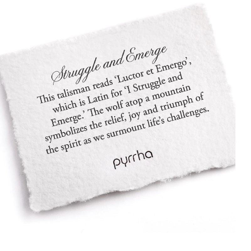 This talisman reads "Luctor et Emergo", which is Latin for "I Struggle and Emerge." The wolf symbolizes the relief, joy and triumph of the spirit as we surmount life's challenges.
