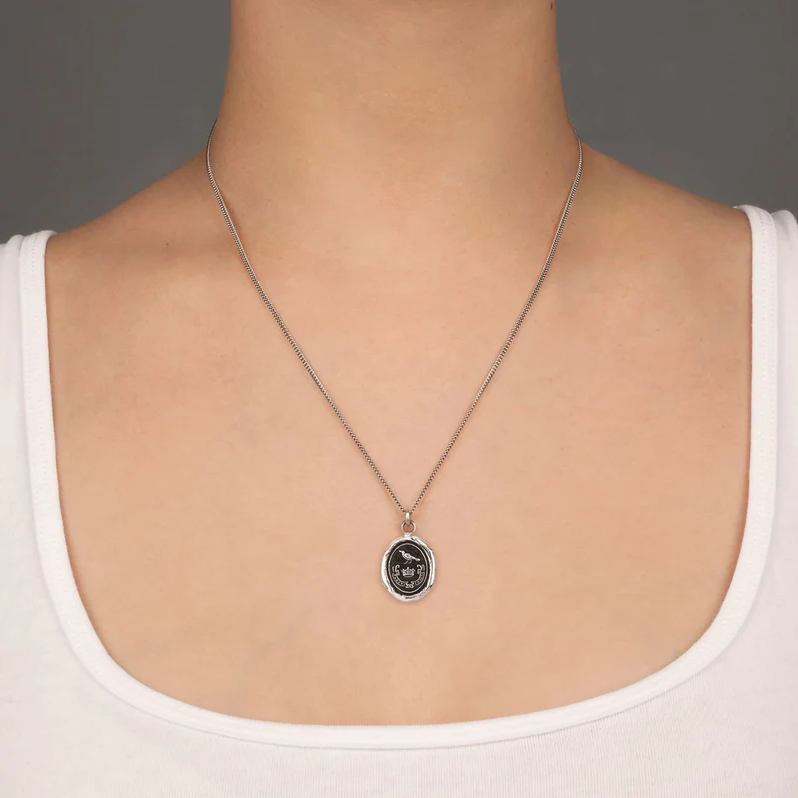 This talisman reads 'Flecti Non Frangi' in Latin, meaning 'To be Bent not Broken'. It refers to one who can endure hardship yet still remain true to themselves. The raven signifies hope and is believed to have keen vision that pierces through all the darkness.